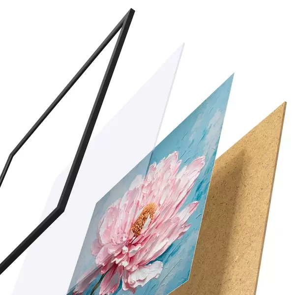 Das Poster besteht aus einem Rahmen, Plexiglas, einem gedruckten Bild und einer Rückwand aus Spanplatten. Dank der Halterungen auf der Rückseite kann das Poster sofort an die Wand gehängt werden.