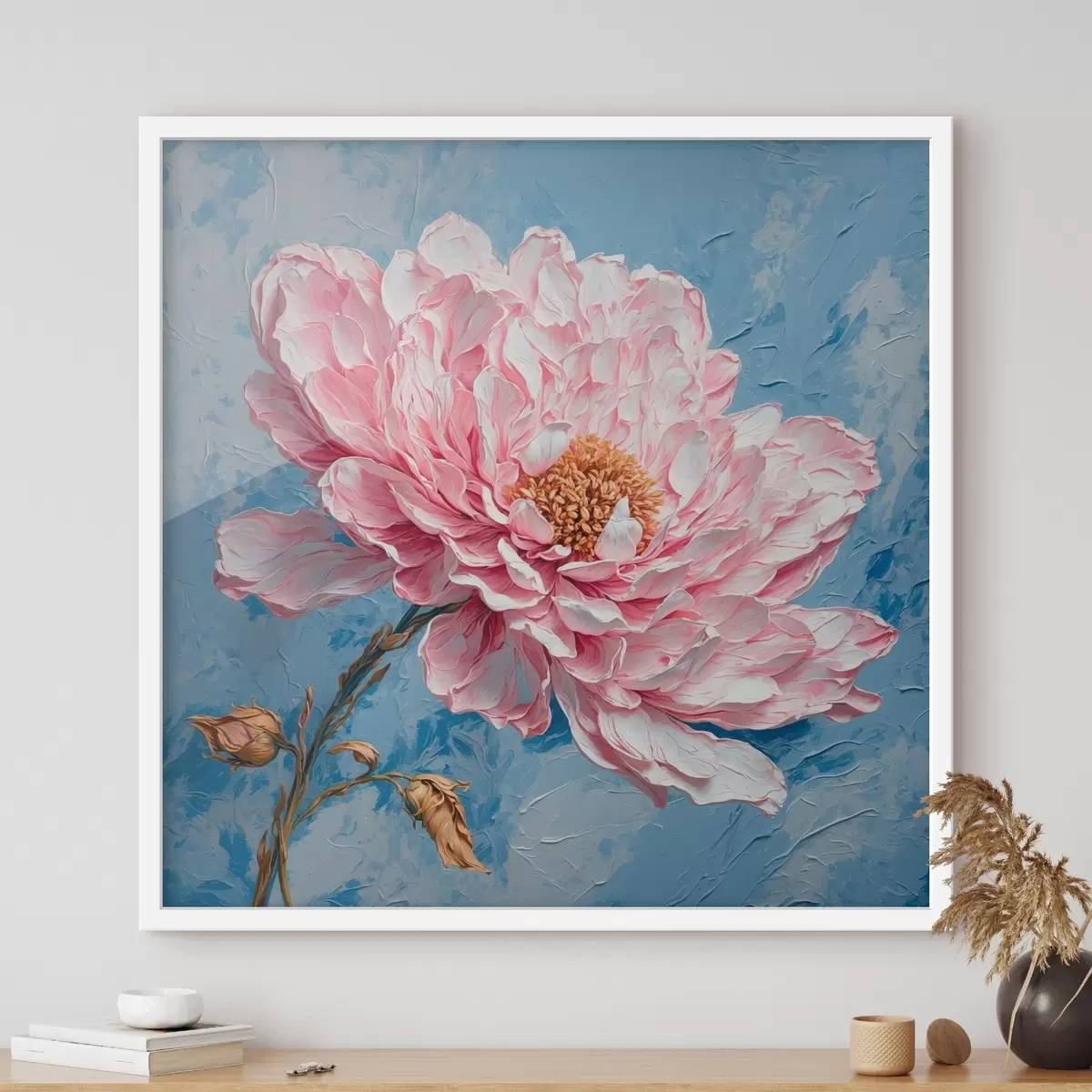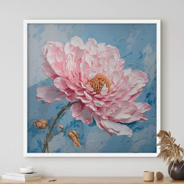 Poster Rosa Blume auf blauem Hintergrund im Stil der Ölmalerei f42537