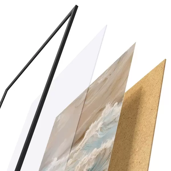 Das Poster besteht aus einem Rahmen, Plexiglas, einem gedruckten Bild und einer Rückwand aus Spanplatten. Dank der Halterungen auf der Rückseite kann das Poster sofort an die Wand gehängt werden.