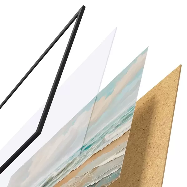 Das Poster besteht aus einem Rahmen, Plexiglas, einem gedruckten Bild und einer Rückwand aus Spanplatten. Dank der Halterungen auf der Rückseite kann das Poster sofort an die Wand gehängt werden.