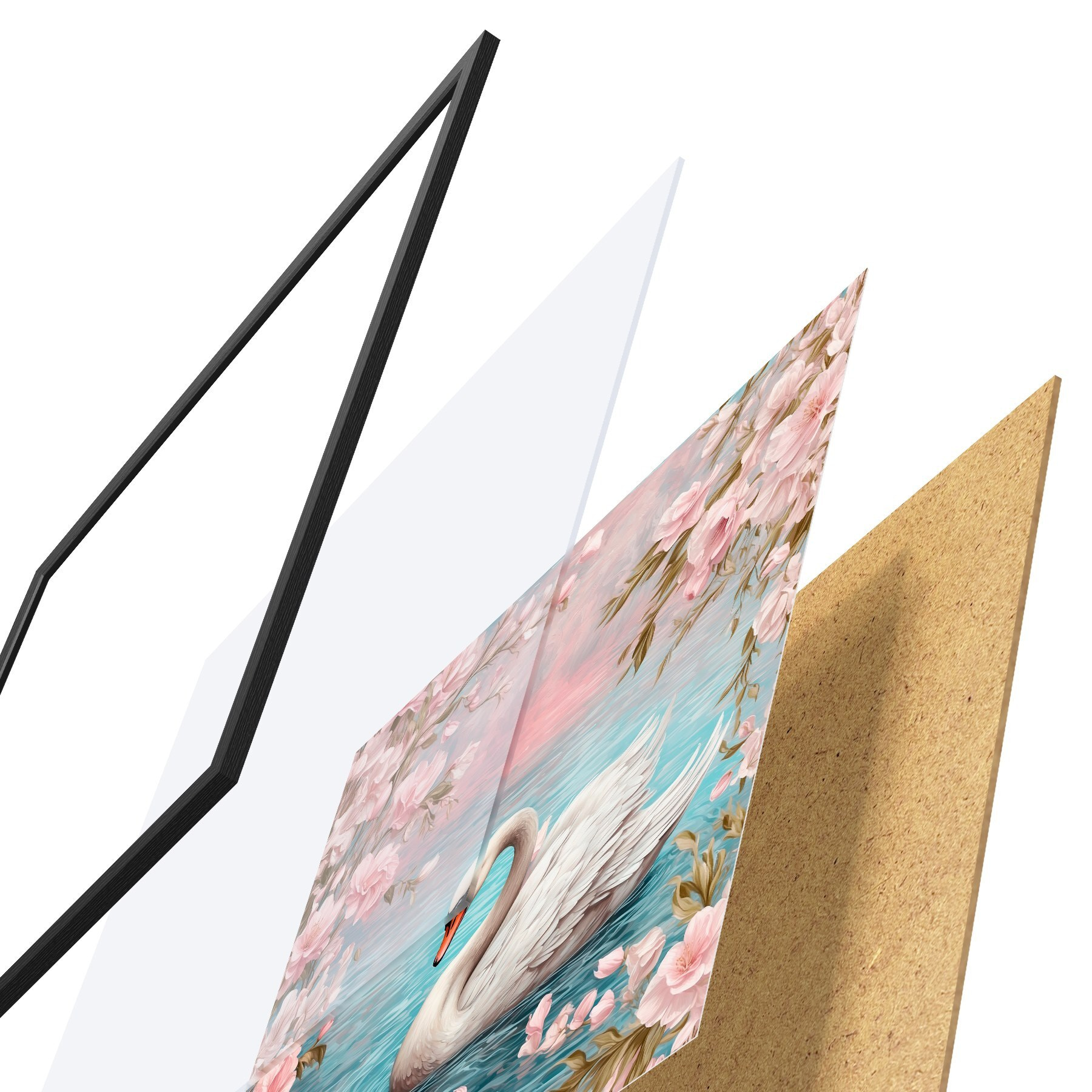 Das Poster besteht aus einem Rahmen, Plexiglas, einem gedruckten Bild und einer Rückwand aus Spanplatten. Dank der Halterungen auf der Rückseite kann das Poster sofort an die Wand gehängt werden.