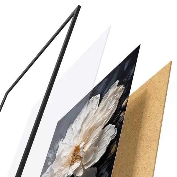 Das Poster besteht aus einem Rahmen, Plexiglas, einem gedruckten Bild und einer Rückwand aus Spanplatten. Dank der Halterungen auf der Rückseite kann das Poster sofort an die Wand gehängt werden.