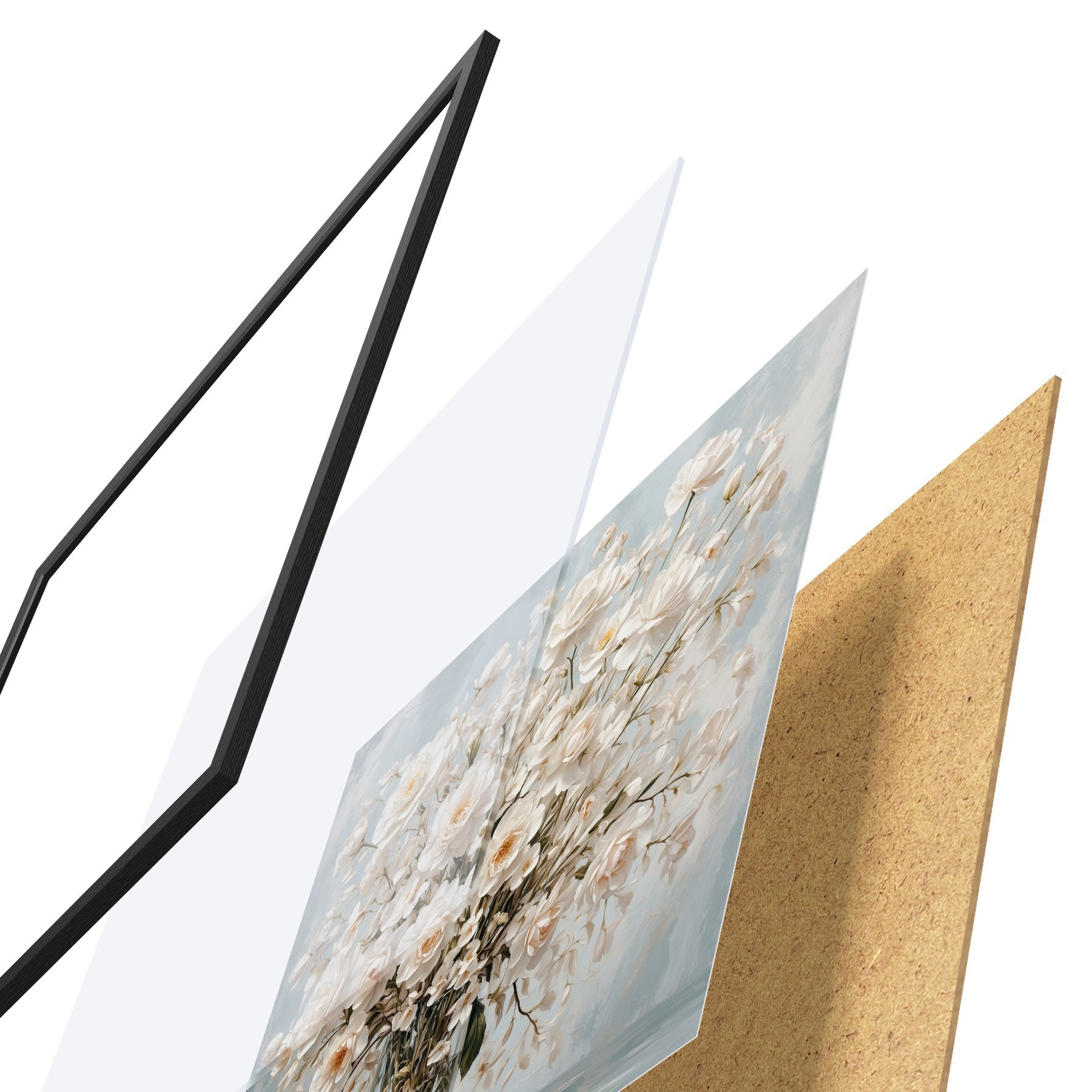 Das Poster besteht aus einem Rahmen, Plexiglas, einem gedruckten Bild und einer Rückwand aus Spanplatten. Dank der Halterungen auf der Rückseite kann das Poster sofort an die Wand gehängt werden.