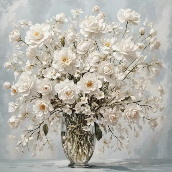 Poster Weiße Blumen in transparenter Vase in Acrylmalerei Stil Nr f42545