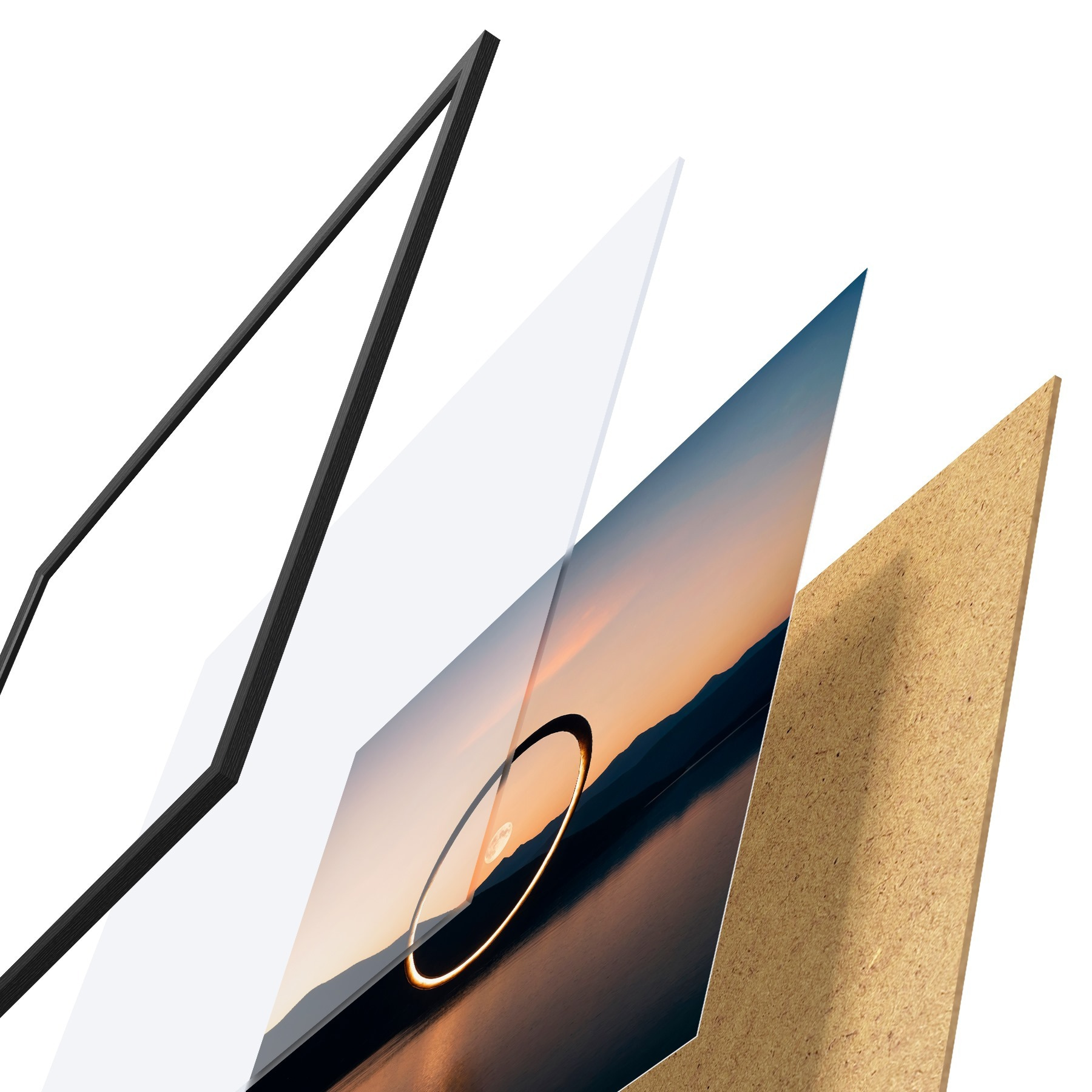 Das Poster besteht aus einem Rahmen, Plexiglas, einem gedruckten Bild und einer Rückwand aus Spanplatten. Dank der Halterungen auf der Rückseite kann das Poster sofort an die Wand gehängt werden.