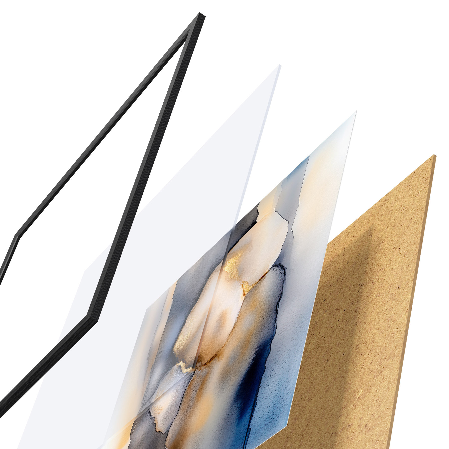 Das Poster besteht aus einem Rahmen, Plexiglas, einem gedruckten Bild und einer Rückwand aus Spanplatten. Dank der Halterungen auf der Rückseite kann das Poster sofort an die Wand gehängt werden.