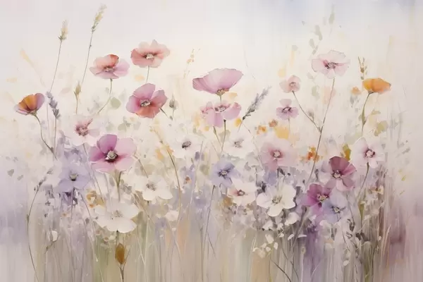 Poster Eine Wiese mit Aquarellblumen in zarten Rosa-, Lila- und Weißtönen, die eine Atmosphäre der Leichtigkeit und Harmonie schaffen. Nr f42557
