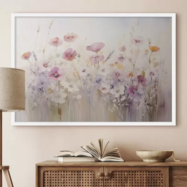 Poster Eine Wiese mit Aquarellblumen in zarten Rosa-, Lila- und Weißtönen, die eine Atmosphäre der Leichtigkeit und Harmonie schaffen. f42557