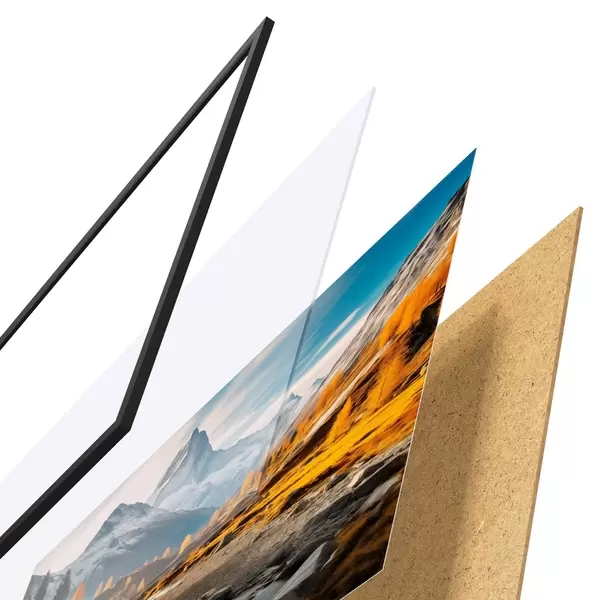 Das Poster besteht aus einem Rahmen, Plexiglas, einem gedruckten Bild und einer Rückwand aus Spanplatten. Dank der Halterungen auf der Rückseite kann das Poster sofort an die Wand gehängt werden.