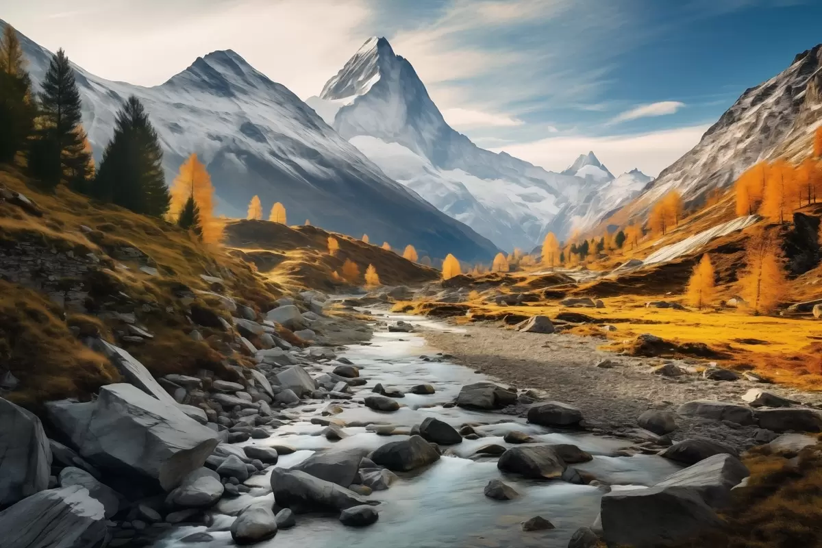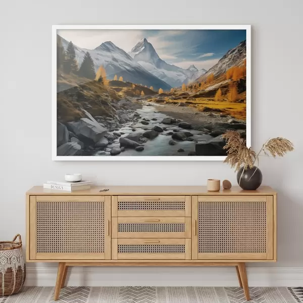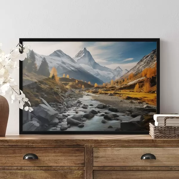 Poster Herbstliche Berglandschaft mit einem reißenden Fluss, Bäumen und einem majestätischen Gipfel vor dem Hintergrund eines klaren Himmels. f42564