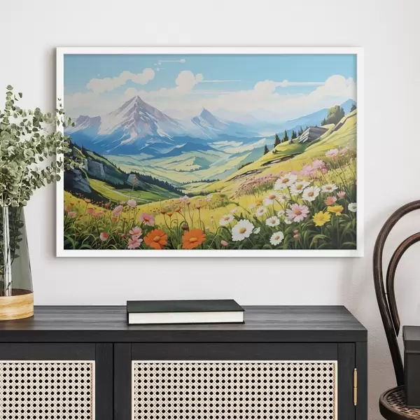 Poster Eine lebendige Berglandschaft mit blühenden Wiesen, grünen Hügeln und majestätischen Gipfeln unter einem strahlend blauen Himmel. f42565