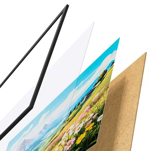 Das Poster besteht aus einem Rahmen, Plexiglas, einem gedruckten Bild und einer Rückwand aus Spanplatten. Dank der Halterungen auf der Rückseite kann das Poster sofort an die Wand gehängt werden.