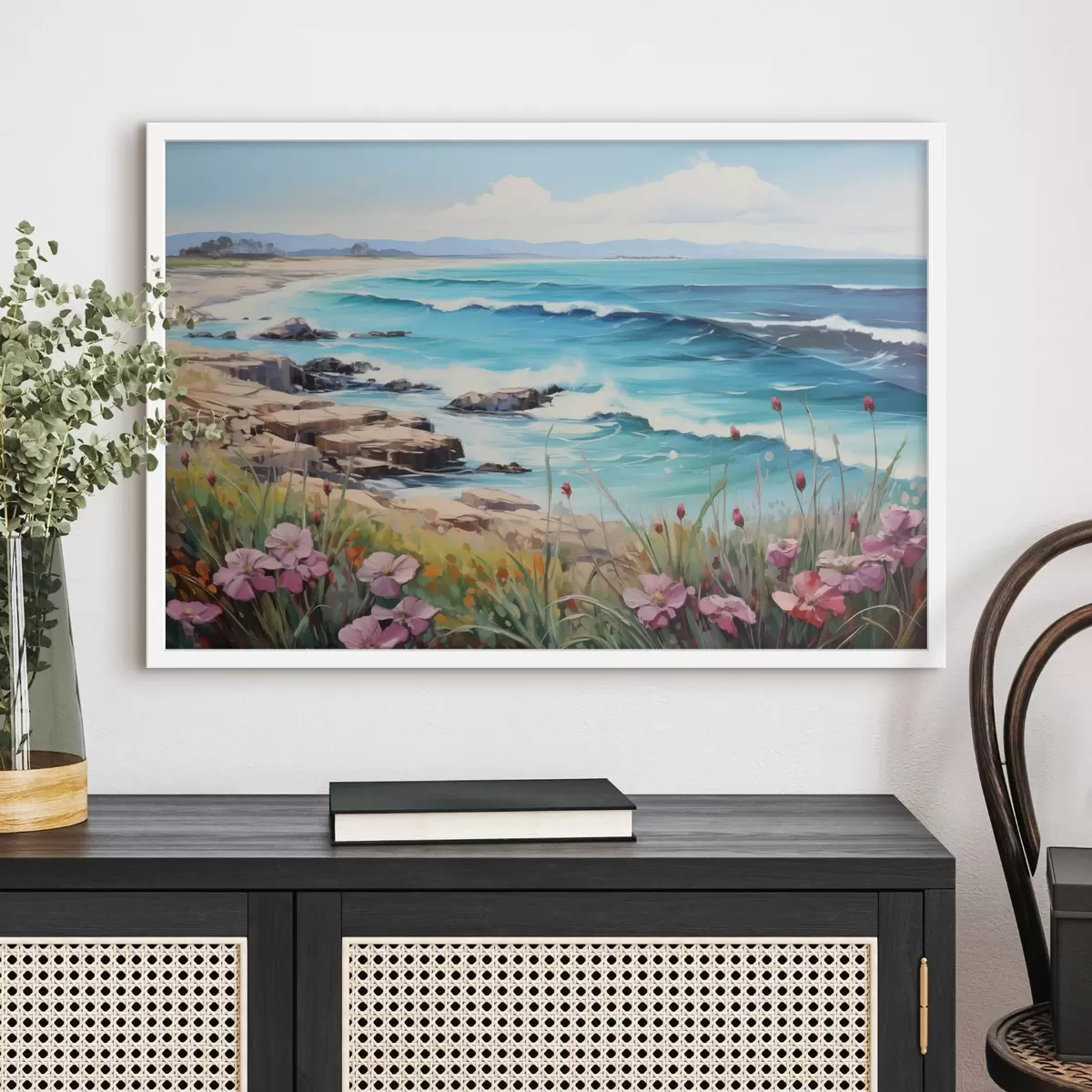 Poster Eine Meereslandschaft mit türkisfarbenen Wellen, einem felsigen Ufer und leuchtenden Blumen im Vordergrund unter einem klaren blauen Himmel. f42568