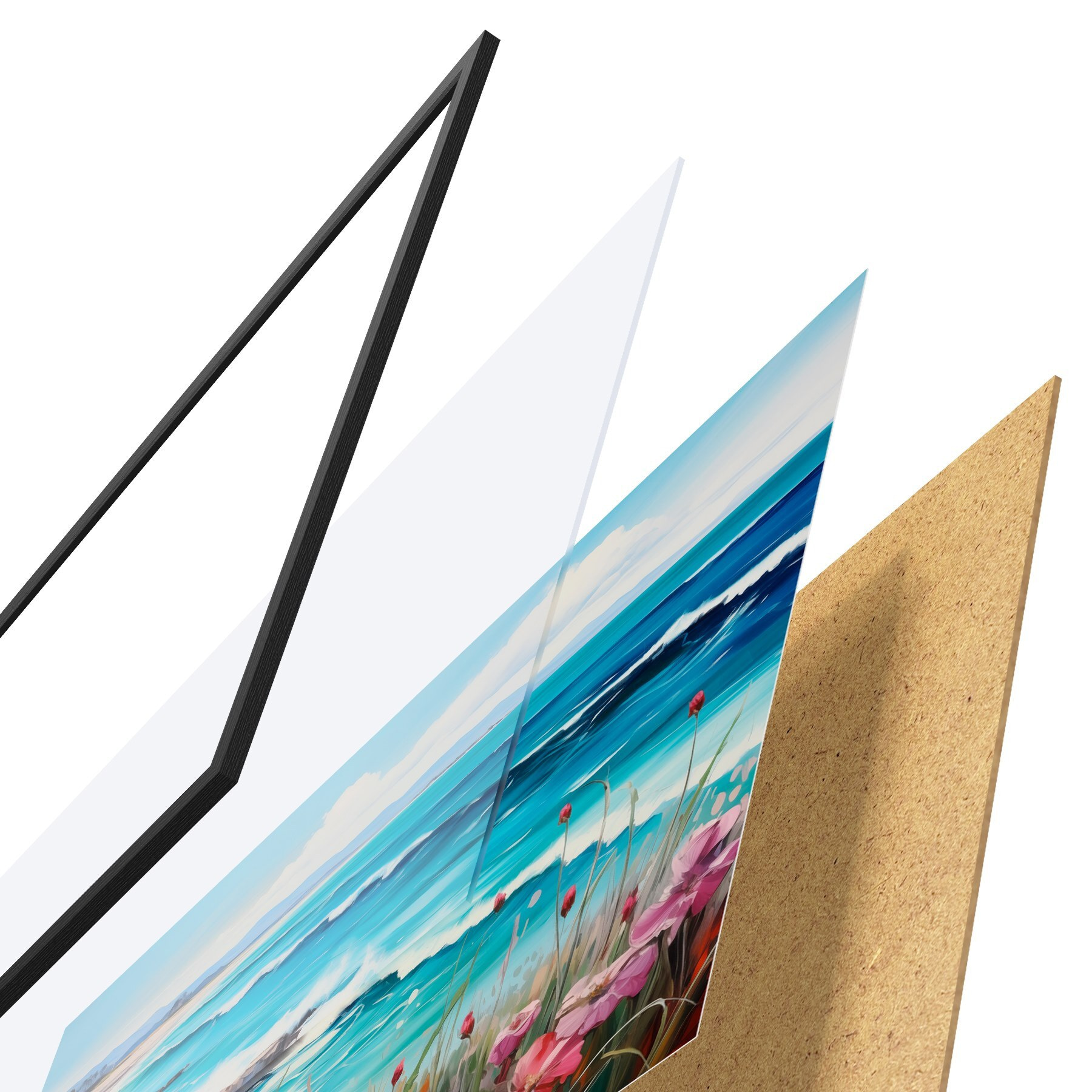 Das Poster besteht aus einem Rahmen, Plexiglas, einem gedruckten Bild und einer Rückwand aus Spanplatten. Dank der Halterungen auf der Rückseite kann das Poster sofort an die Wand gehängt werden.