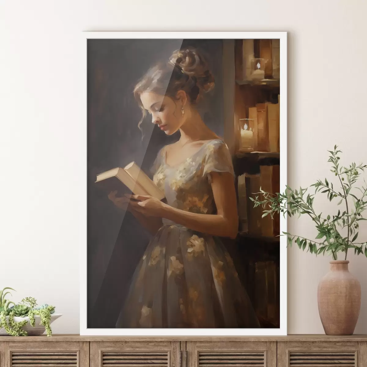 Poster Eine junge Frau in einem eleganten Kleid liest ein Buch in stimmungsvoller Beleuchtung, umgeben von Bücherregalen und dem sanften Schein von Kerzen. Nr f42570