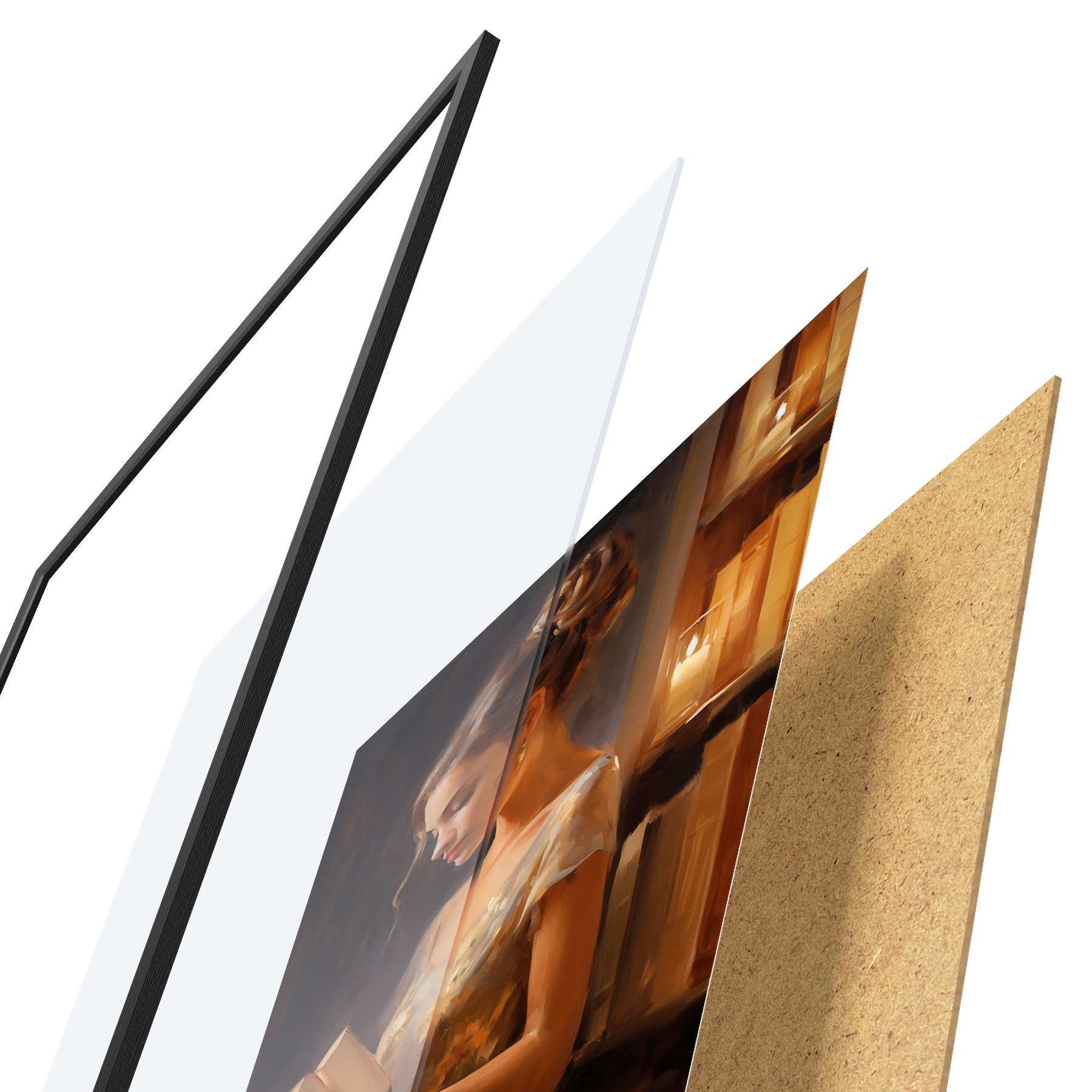 Poster Eine junge Frau in einem eleganten Kleid liest ein Buch in stimmungsvoller Beleuchtung, umgeben von Bücherregalen und dem sanften Schein von Kerzen. f42570