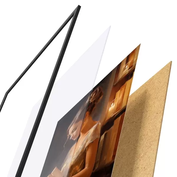 Das Poster besteht aus einem Rahmen, Plexiglas, einem gedruckten Bild und einer Rückwand aus Spanplatten. Dank der Halterungen auf der Rückseite kann das Poster sofort an die Wand gehängt werden.