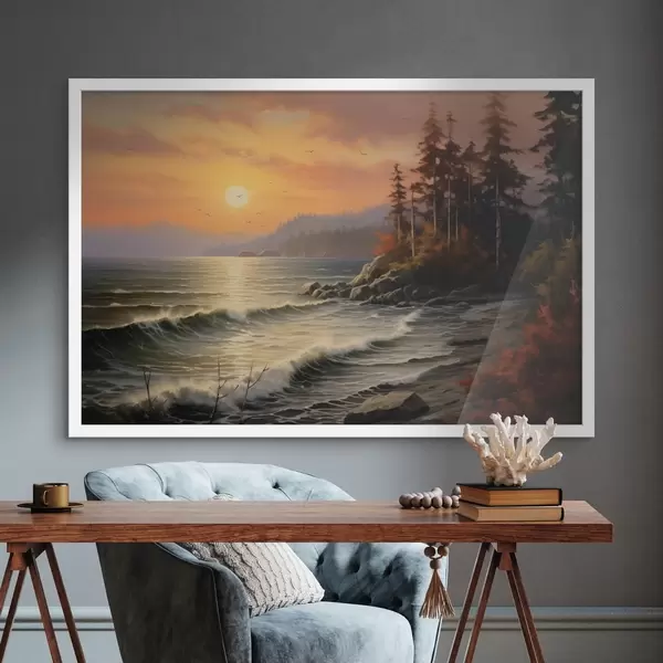 Poster Ein Sonnenuntergang über dem Meer mit Wellen, einem Kiefernwald und Herbstfarben im Vordergrund. Nr f42571