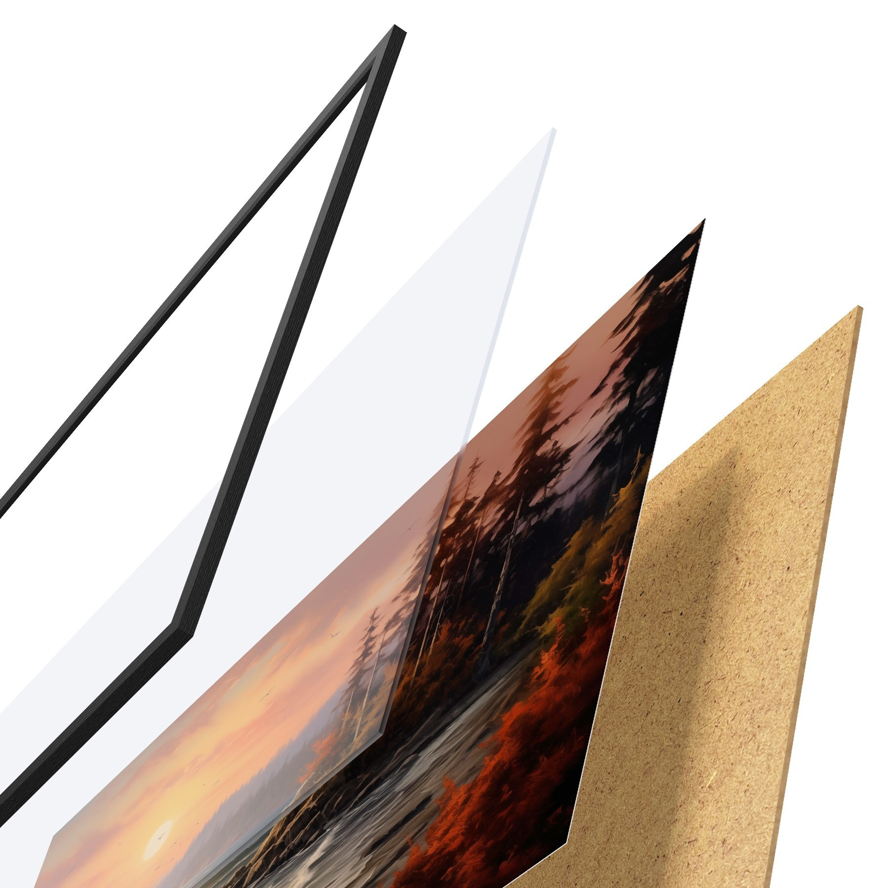 Poster Ein Sonnenuntergang über dem Meer mit Wellen, einem Kiefernwald und Herbstfarben im Vordergrund. f42571