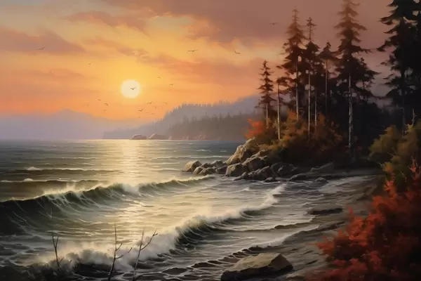 Poster Ein Sonnenuntergang über dem Meer mit Wellen, einem Kiefernwald und Herbstfarben im Vordergrund. f42571