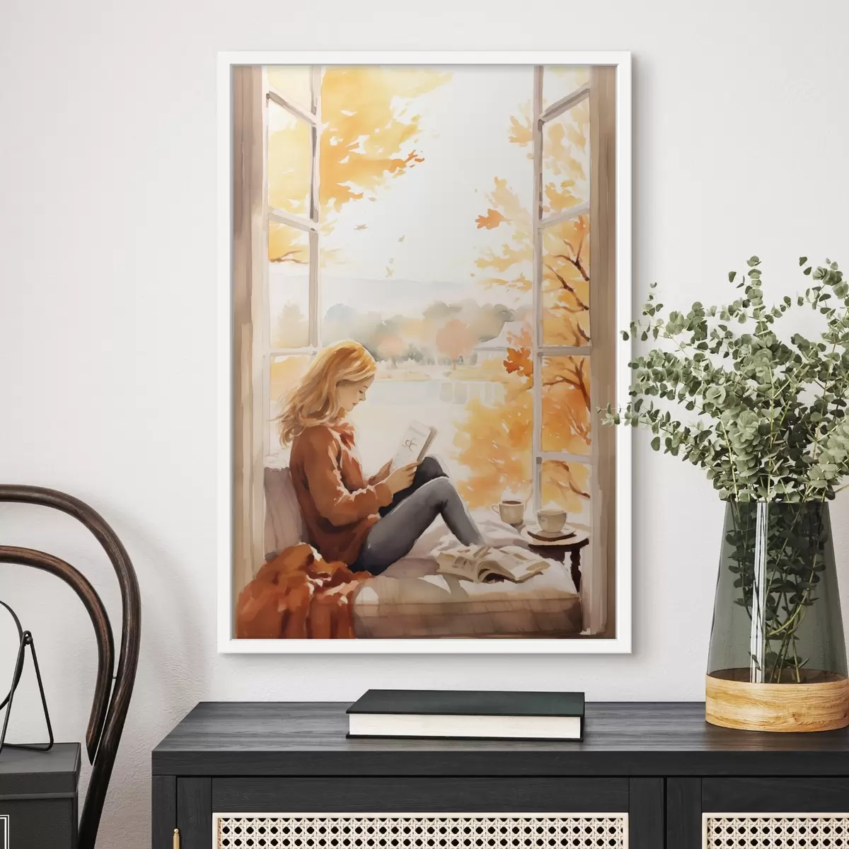 Poster Ein Mädchen liest ein Buch am offenen Fenster in einer herbstlichen Kulisse, mit hellen Bäumen im Hintergrund und einer Tasse Tee in der Nähe. Nr f42572