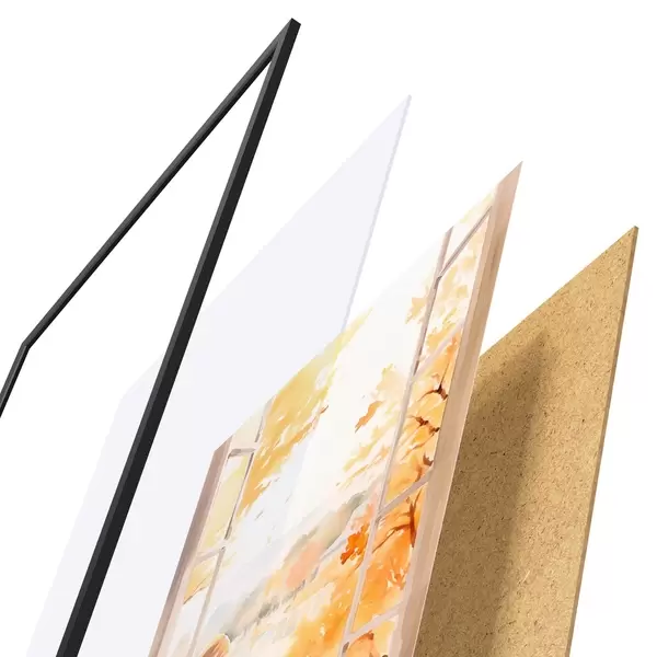 Das Poster besteht aus einem Rahmen, Plexiglas, einem gedruckten Bild und einer Rückwand aus Spanplatten. Dank der Halterungen auf der Rückseite kann das Poster sofort an die Wand gehängt werden.