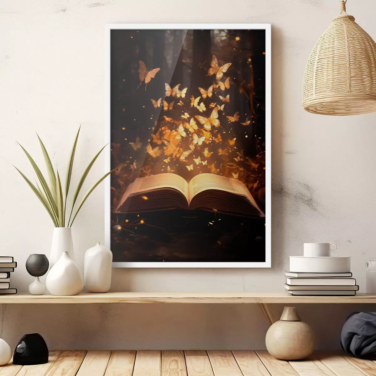 Poster Ein aufgeschlagenes Buch, aus dem leuchtende Schmetterlinge auftauchen, die in Lichtstrahlen in einem dunklen, magischen Wald leuchten. Nr f42573