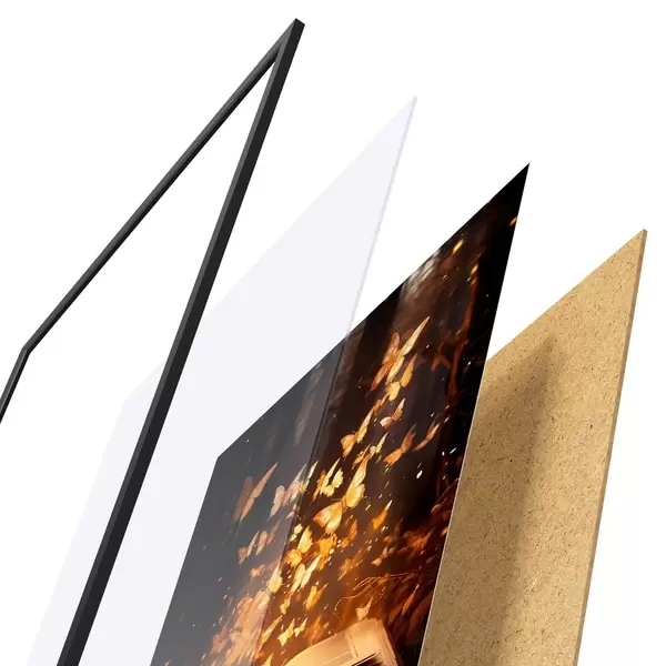 Das Poster besteht aus einem Rahmen, Plexiglas, einem gedruckten Bild und einer Rückwand aus Spanplatten. Dank der Halterungen auf der Rückseite kann das Poster sofort an die Wand gehängt werden.