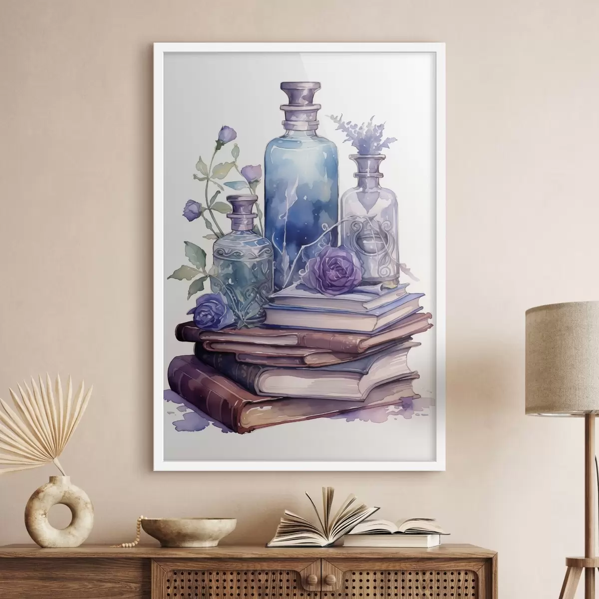 Poster Ein Stillleben mit alten Büchern, Glasflaschen in blau-violetten Tönen und dekorativen Blumen. Nr f42574