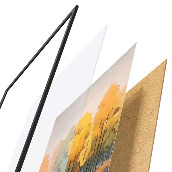 Das Poster besteht aus einem Rahmen, Plexiglas, einem gedruckten Bild und einer Rückwand aus Spanplatten. Dank der Halterungen auf der Rückseite kann das Poster sofort an die Wand gehängt werden.