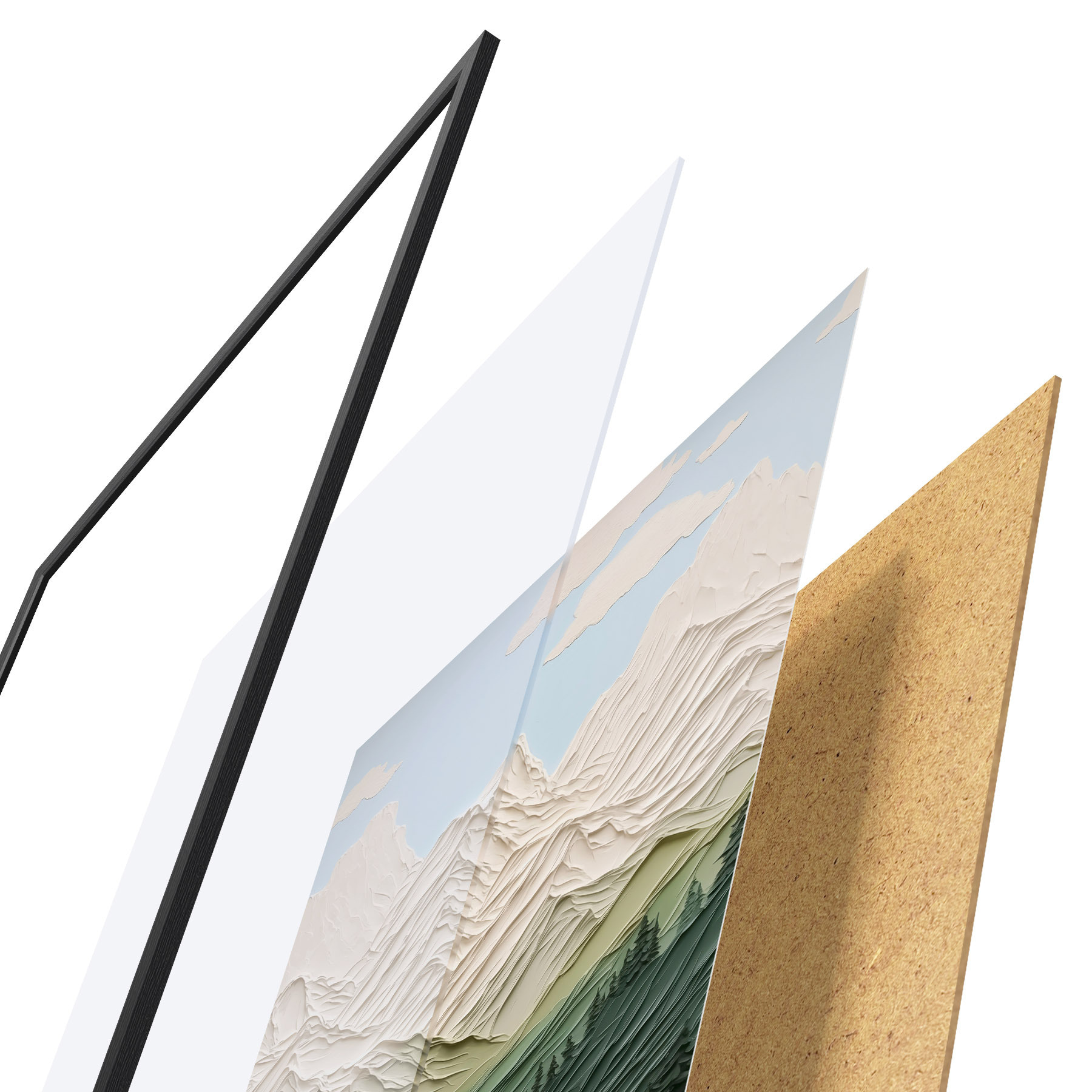 Das Poster besteht aus einem Rahmen, Plexiglas, einem gedruckten Bild und einer Rückwand aus Spanplatten. Dank der Halterungen auf der Rückseite kann das Poster sofort an die Wand gehängt werden.