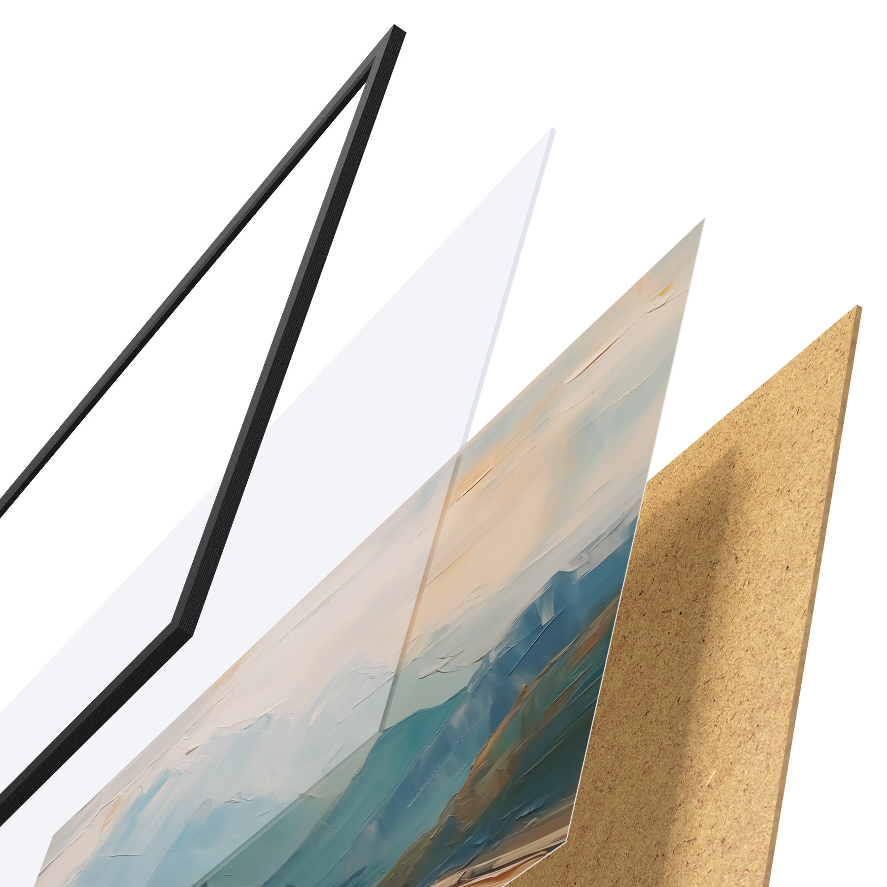 Das Poster besteht aus einem Rahmen, Plexiglas, einem gedruckten Bild und einer Rückwand aus Spanplatten. Dank der Halterungen auf der Rückseite kann das Poster sofort an die Wand gehängt werden.