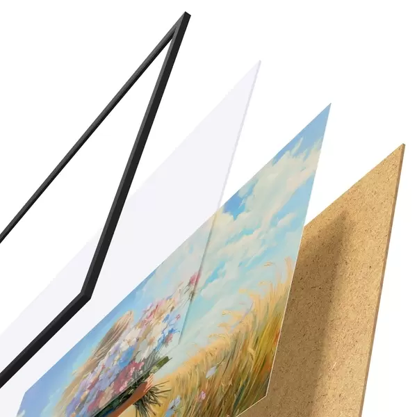 Das Poster besteht aus einem Rahmen, Plexiglas, einem gedruckten Bild und einer Rückwand aus Spanplatten. Dank der Halterungen auf der Rückseite kann das Poster sofort an die Wand gehängt werden.