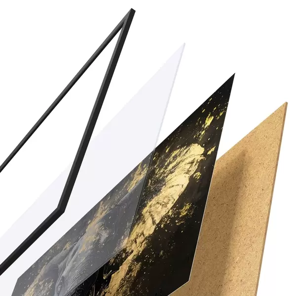 Das Poster besteht aus einem Rahmen, Plexiglas, einem gedruckten Bild und einer Rückwand aus Spanplatten. Dank der Halterungen auf der Rückseite kann das Poster sofort an die Wand gehängt werden.