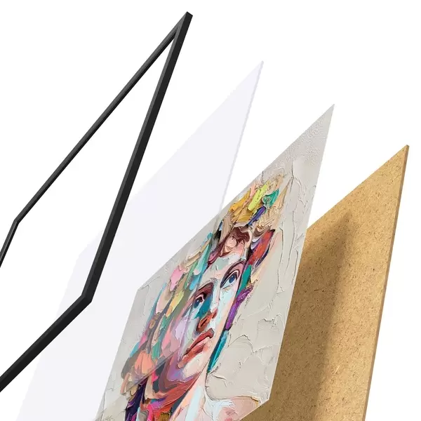 Das Poster besteht aus einem Rahmen, Plexiglas, einem gedruckten Bild und einer Rückwand aus Spanplatten. Dank der Halterungen auf der Rückseite kann das Poster sofort an die Wand gehängt werden.