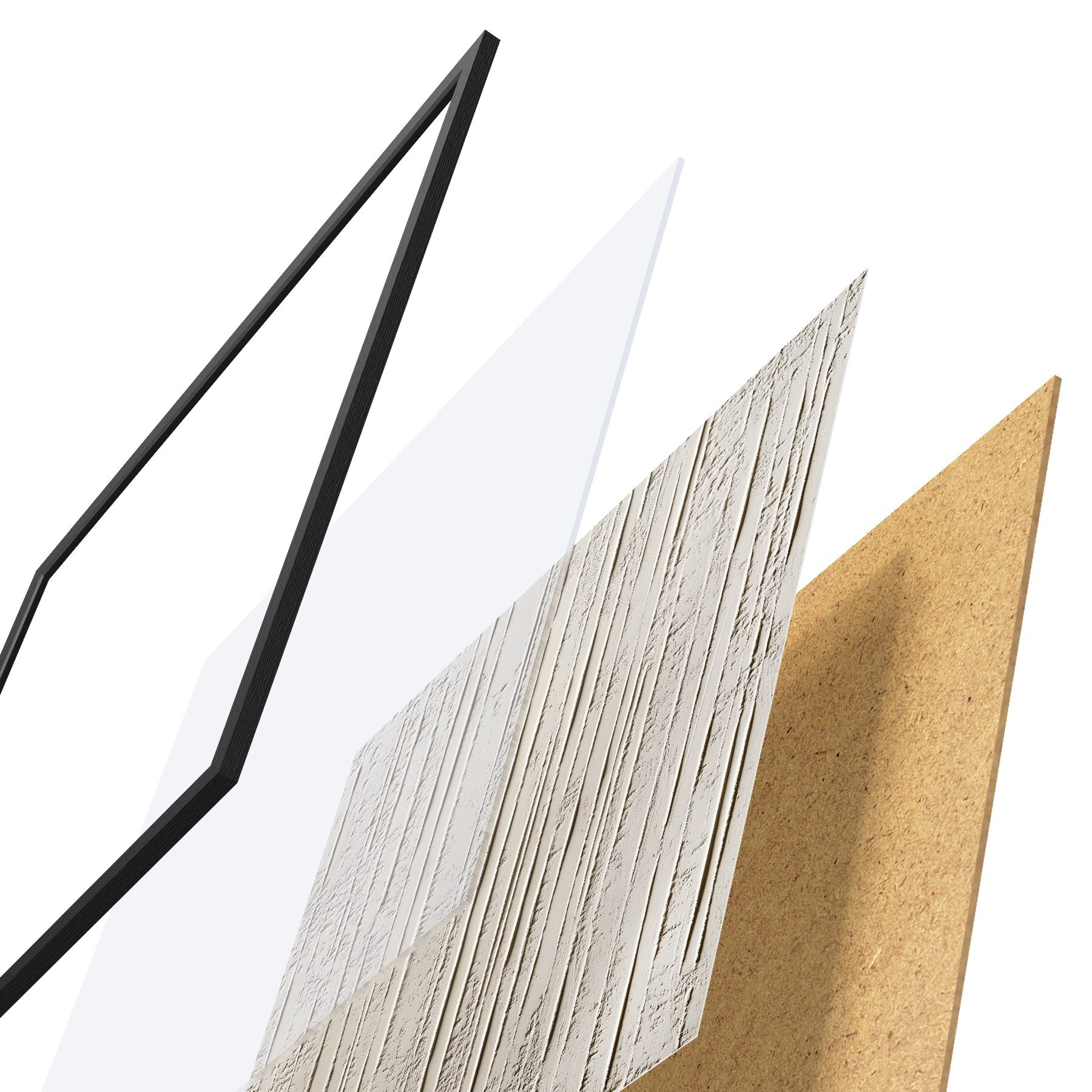 Das Poster besteht aus einem Rahmen, Plexiglas, einem gedruckten Bild und einer Rückwand aus Spanplatten. Dank der Halterungen auf der Rückseite kann das Poster sofort an die Wand gehängt werden.