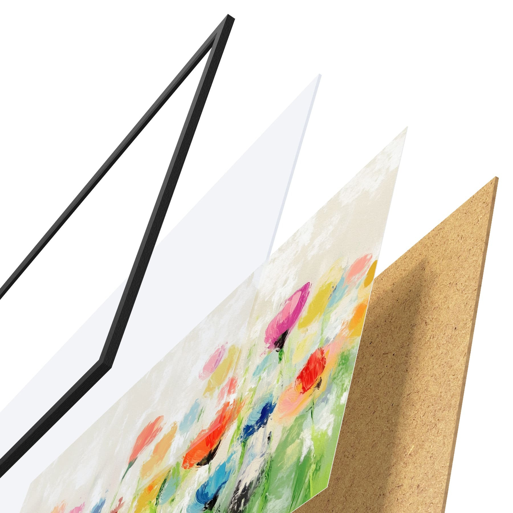 Das Poster besteht aus einem Rahmen, Plexiglas, einem gedruckten Bild und einer Rückwand aus Spanplatten. Dank der Halterungen auf der Rückseite kann das Poster sofort an die Wand gehängt werden.
