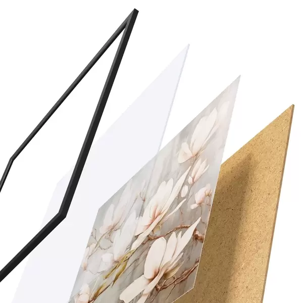Das Poster besteht aus einem Rahmen, Plexiglas, einem gedruckten Bild und einer Rückwand aus Spanplatten. Dank der Halterungen auf der Rückseite kann das Poster sofort an die Wand gehängt werden.