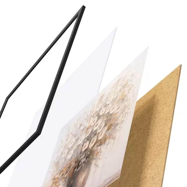 Das Poster besteht aus einem Rahmen, Plexiglas, einem gedruckten Bild und einer Rückwand aus Spanplatten. Dank der Halterungen auf der Rückseite kann das Poster sofort an die Wand gehängt werden.