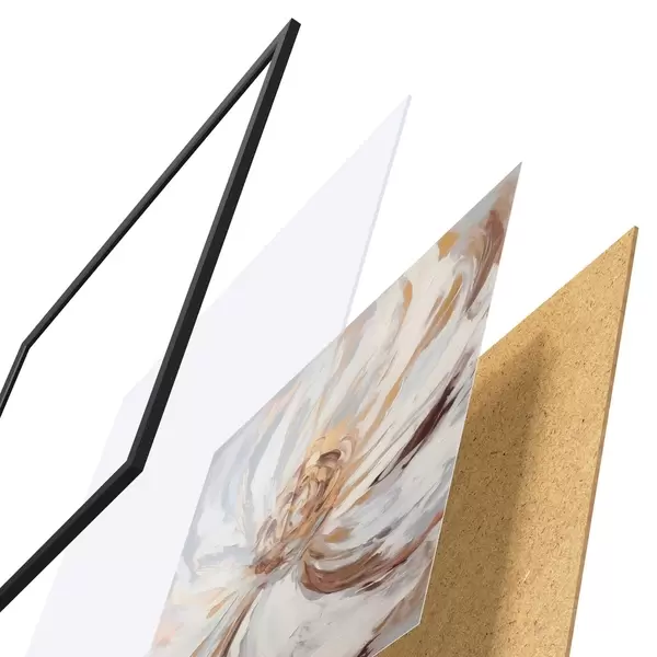Das Poster besteht aus einem Rahmen, Plexiglas, einem gedruckten Bild und einer Rückwand aus Spanplatten. Dank der Halterungen auf der Rückseite kann das Poster sofort an die Wand gehängt werden.