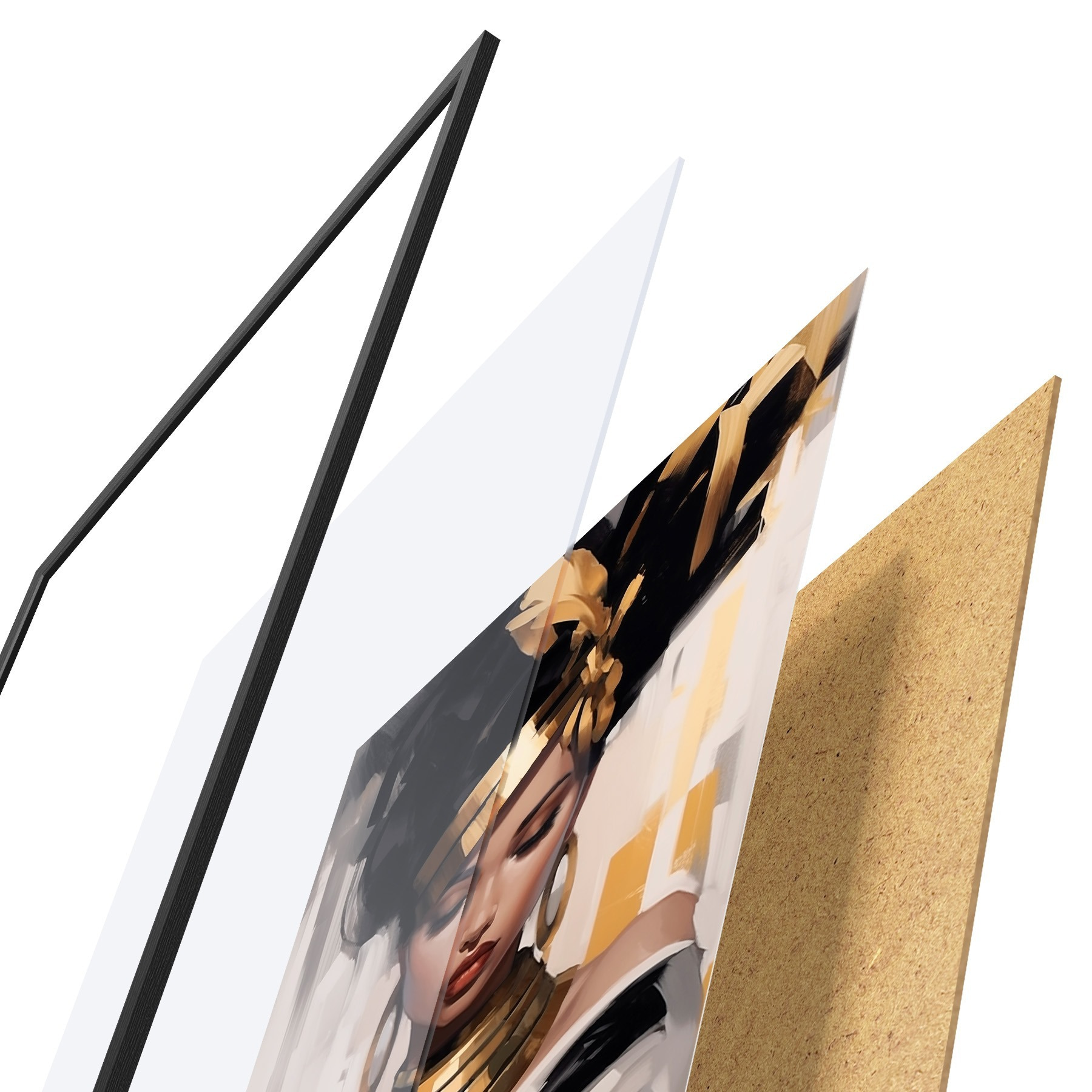 Das Poster besteht aus einem Rahmen, Plexiglas, einem gedruckten Bild und einer Rückwand aus Spanplatten. Dank der Halterungen auf der Rückseite kann das Poster sofort an die Wand gehängt werden.