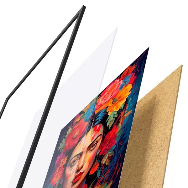 Das Poster besteht aus einem Rahmen, Plexiglas, einem gedruckten Bild und einer Rückwand aus Spanplatten. Dank der Halterungen auf der Rückseite kann das Poster sofort an die Wand gehängt werden.