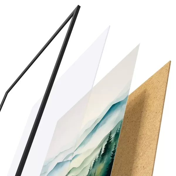 Das Poster besteht aus einem Rahmen, Plexiglas, einem gedruckten Bild und einer Rückwand aus Spanplatten. Dank der Halterungen auf der Rückseite kann das Poster sofort an die Wand gehängt werden.