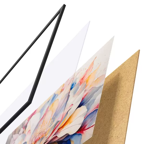 Das Poster besteht aus einem Rahmen, Plexiglas, einem gedruckten Bild und einer Rückwand aus Spanplatten. Dank der Halterungen auf der Rückseite kann das Poster sofort an die Wand gehängt werden.