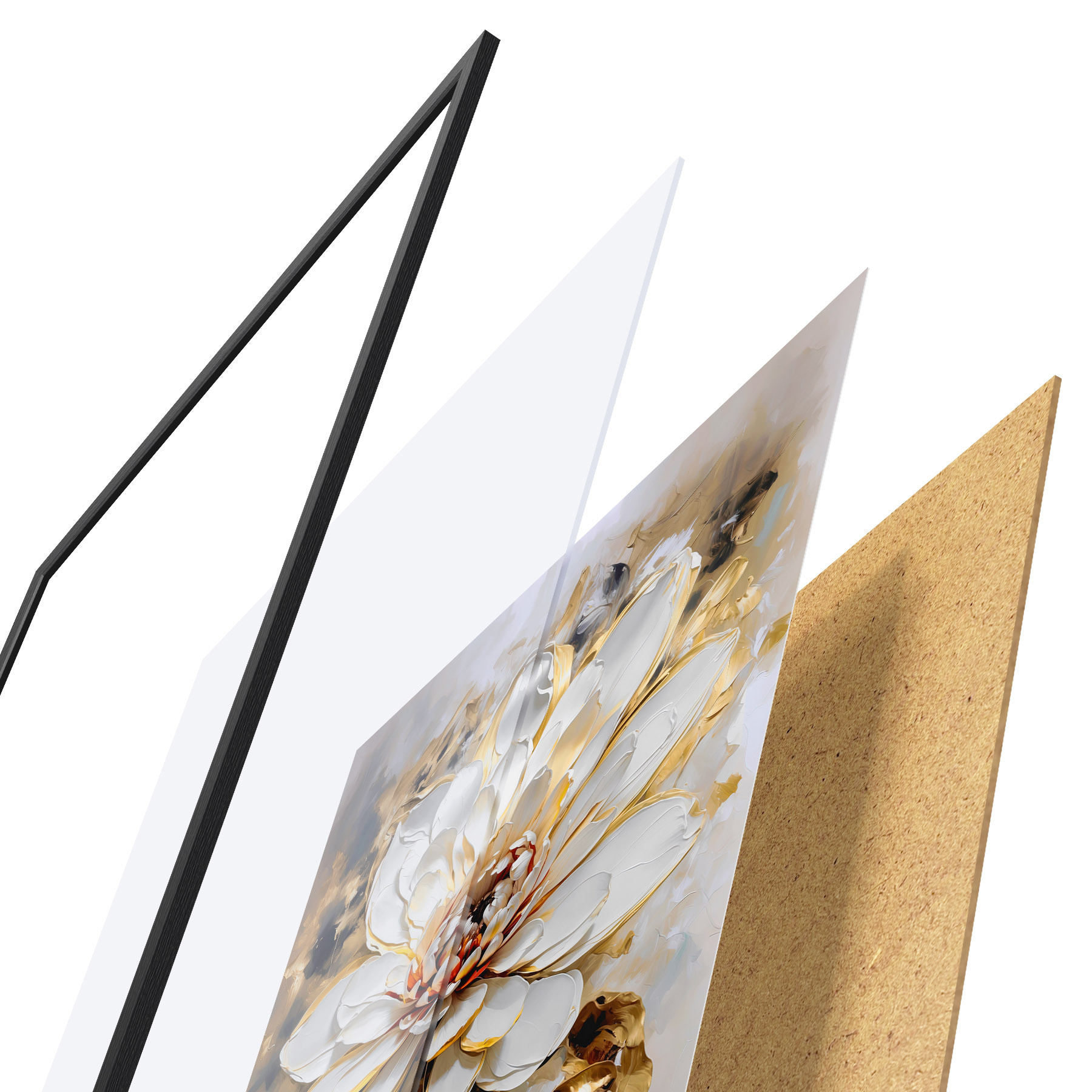 Das Poster besteht aus einem Rahmen, Plexiglas, einem gedruckten Bild und einer Rückwand aus Spanplatten. Dank der Halterungen auf der Rückseite kann das Poster sofort an die Wand gehängt werden.