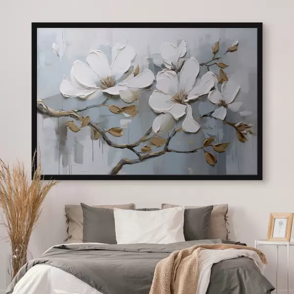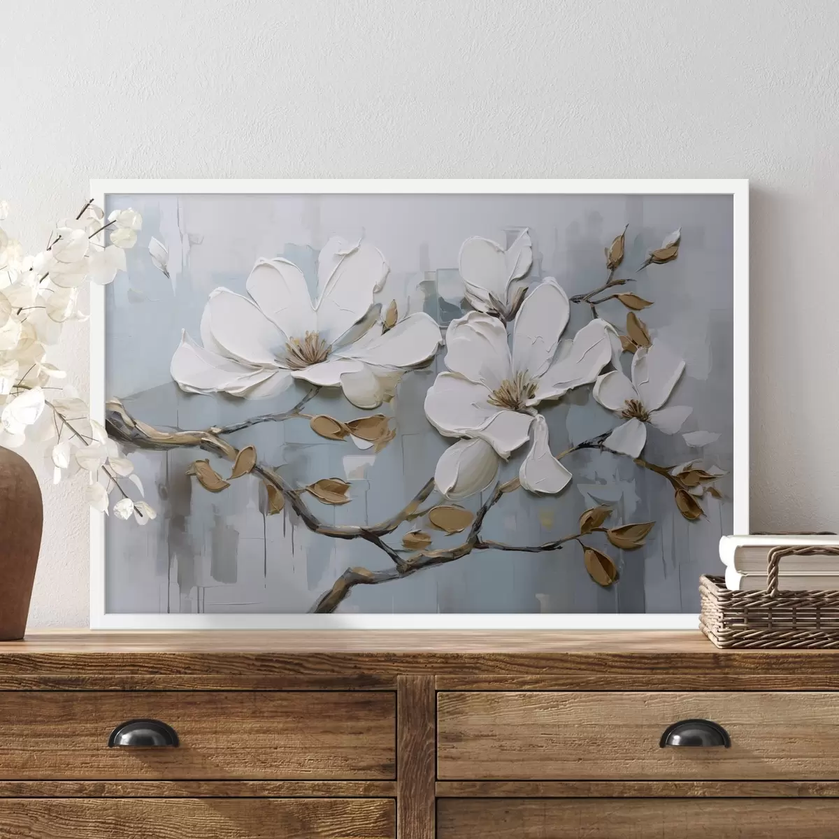 Poster Weiße Magnolienblüten mit strukturierten Blütenblättern und braunen Blättern auf einem weichen blauen Hintergrund Ölgemälde Imitation f42711