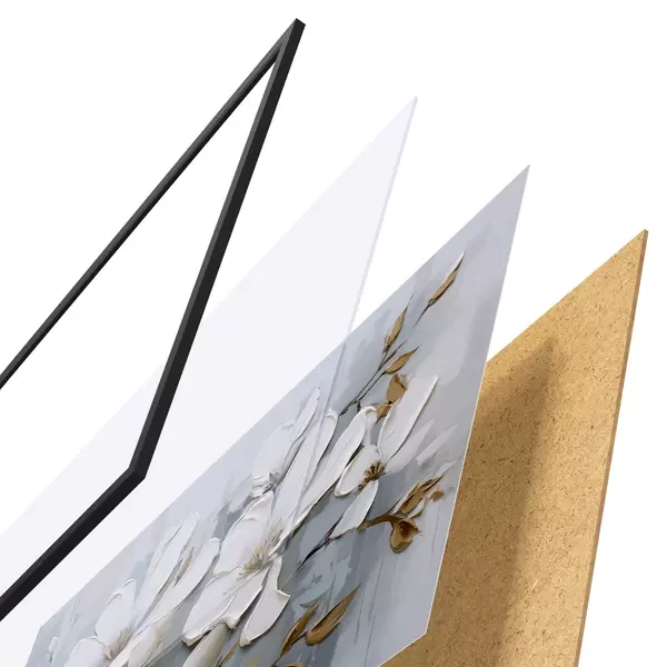 Das Poster besteht aus einem Rahmen, Plexiglas, einem gedruckten Bild und einer Rückwand aus Spanplatten. Dank der Halterungen auf der Rückseite kann das Poster sofort an die Wand gehängt werden.