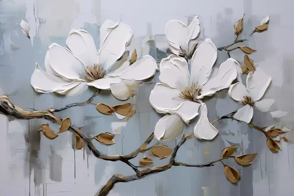 Poster Weiße Magnolienblüten mit strukturierten Blütenblättern und braunen Blättern auf einem weichen blauen Hintergrund Ölgemälde Imitation f42711