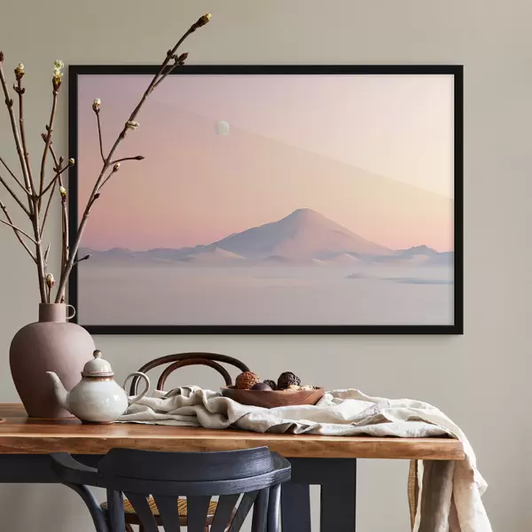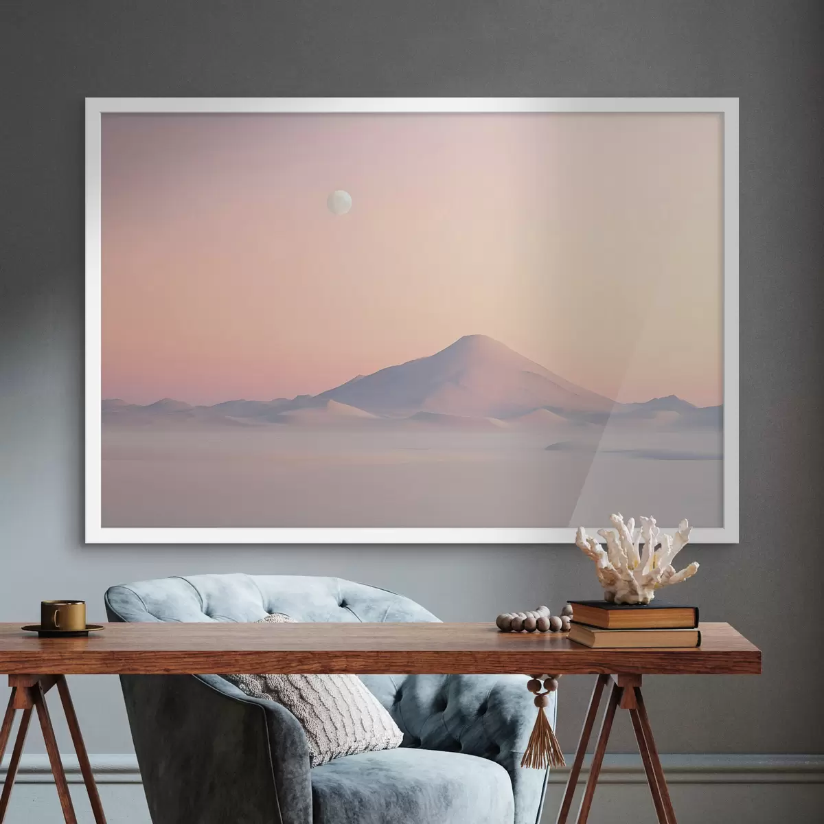 Poster Ein großer Berg mit einem sanften Abhang in sanften Pastellfarben mit einem blassen Mond am Himmel f42718