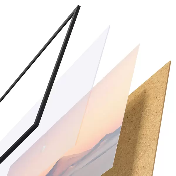 Das Poster besteht aus einem Rahmen, Plexiglas, einem gedruckten Bild und einer Rückwand aus Spanplatten. Dank der Halterungen auf der Rückseite kann das Poster sofort an die Wand gehängt werden.